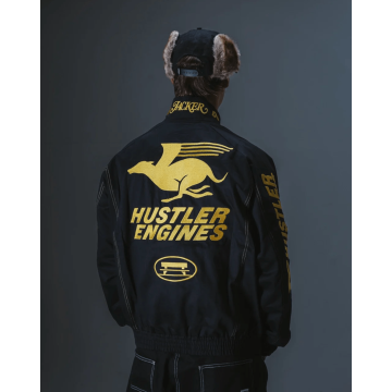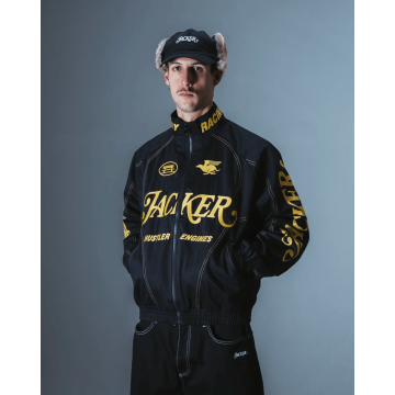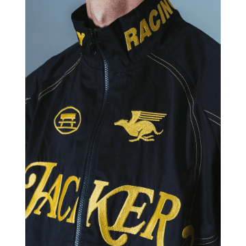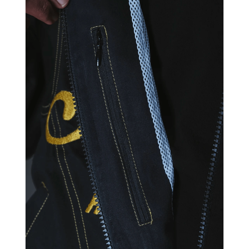 Flag textile signature cousu. Coupe légèrement ample, idéale pour les saisons intermédiaires ou les soirées d'été plus fraîches.