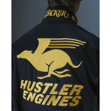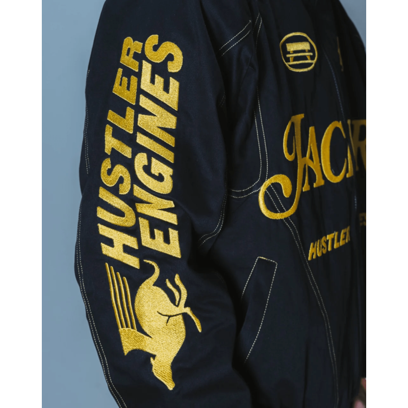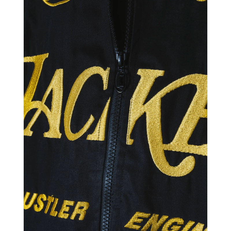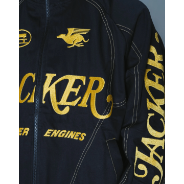 Poches multiples sur le devant, coutures contrastées apparentes et broderie placée.